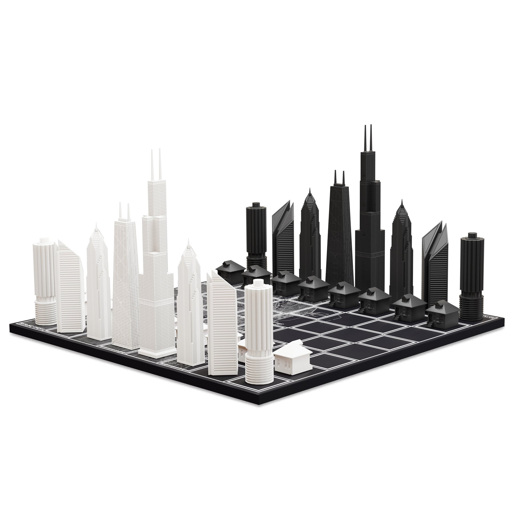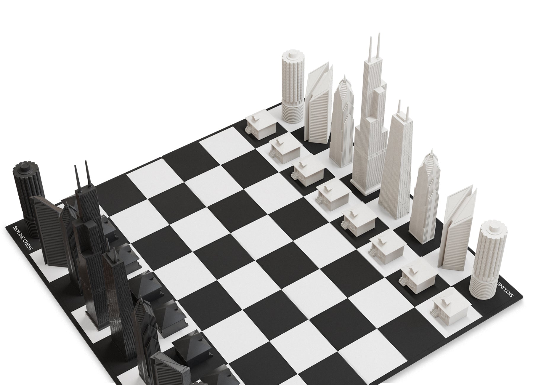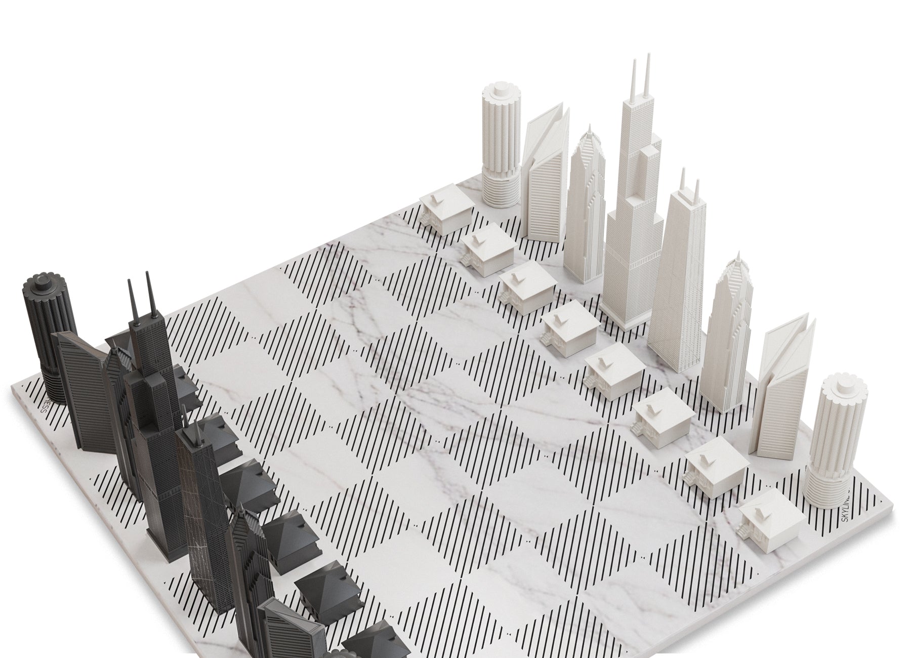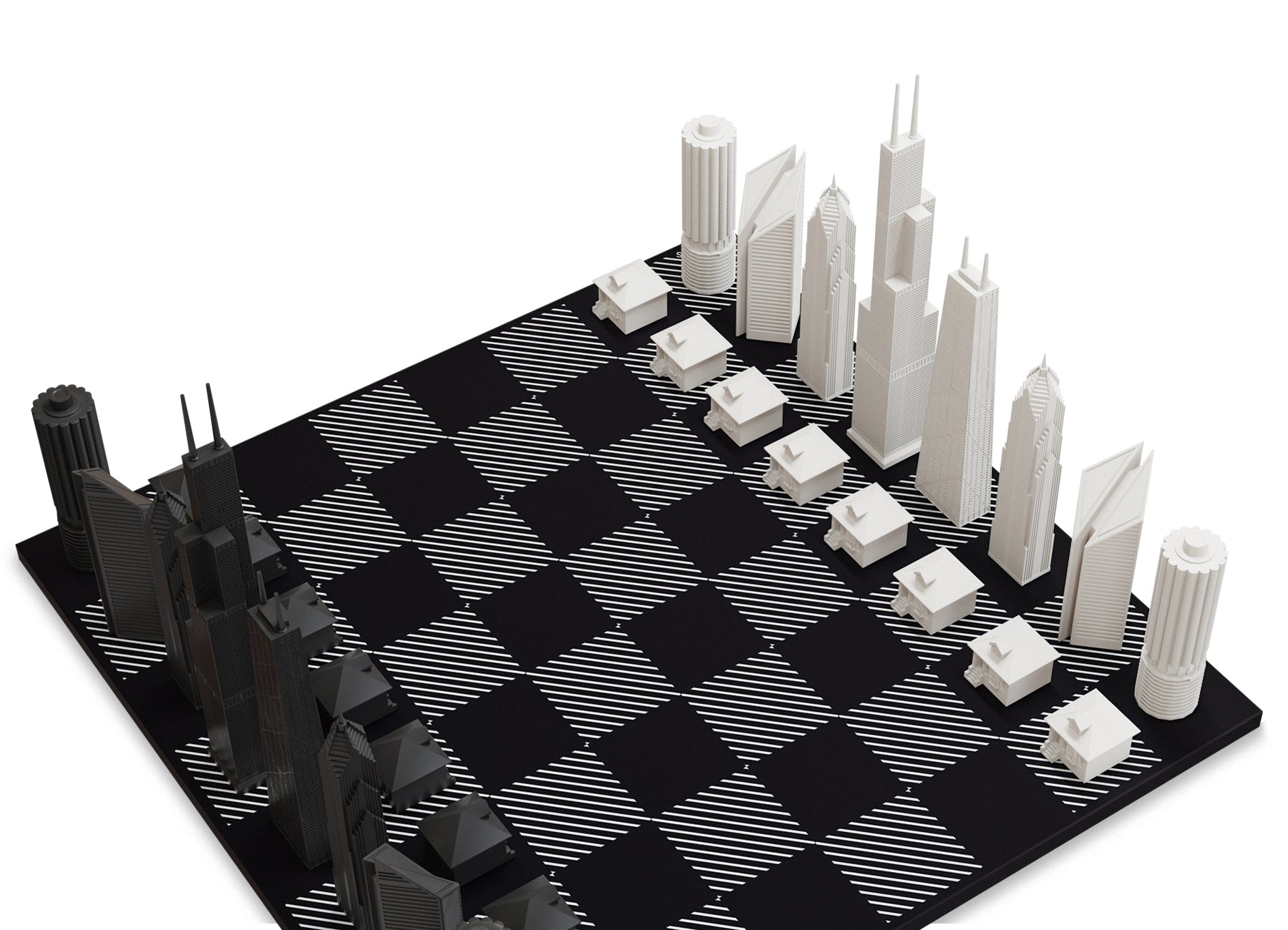 The pawn is played by the famous Chicago Bungalow, the circular form of Marina City makes for a mighty Rook, The Crain Communications Building steps in as the Knight, whilst Two Prudential Plaza plays the perfect Bishop. Willis Tower and the John Hancock Centre take centre stage on the board as the King and Queen.