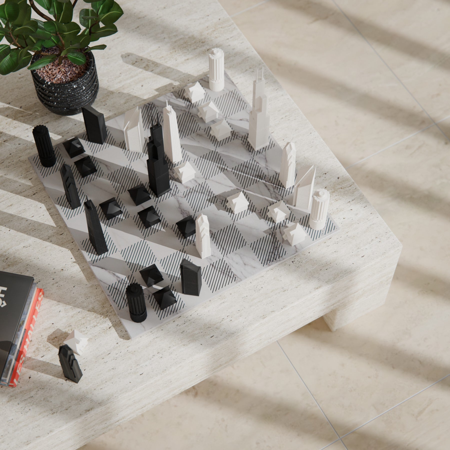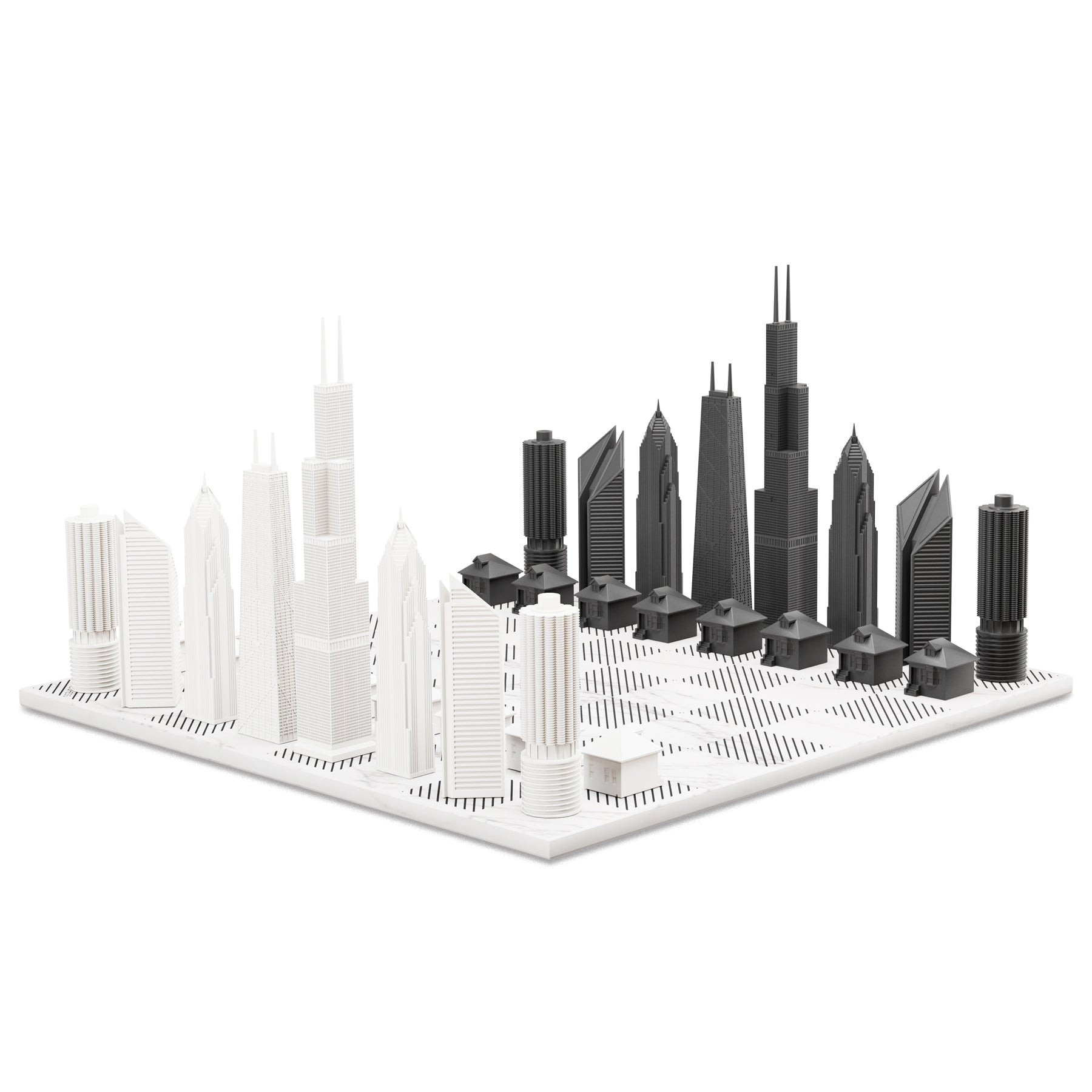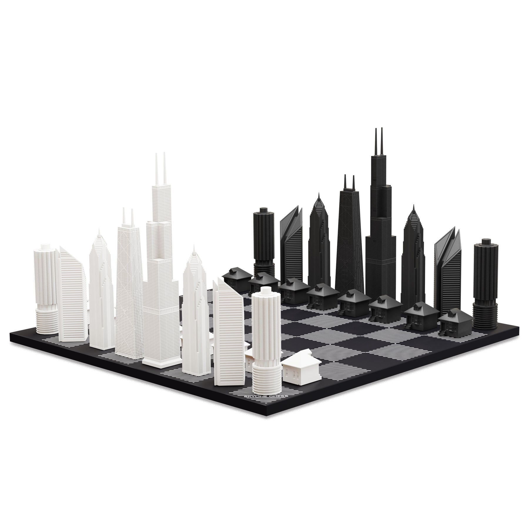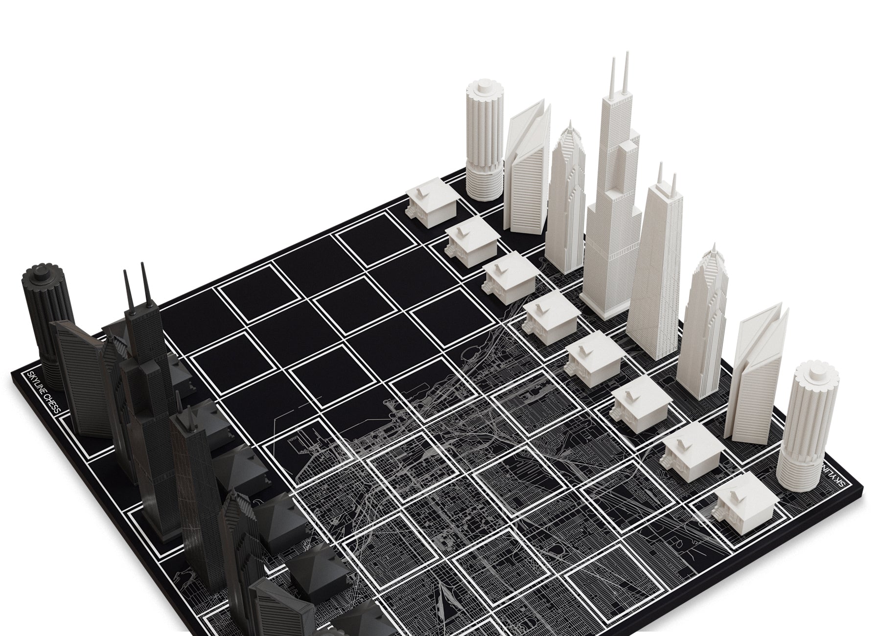 The pawn is played by the famous Chicago Bungalow, the circular form of Marina City makes for a mighty Rook, The Crain Communications Building steps in as the Knight, whilst Two Prudential Plaza plays the perfect Bishop. Willis Tower and the John Hancock Centre take centre stage on the board as the King and Queen.
